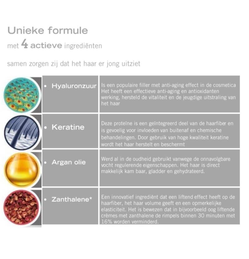 • Zanthalen is een innovatief complex van actieve ingrediënten, dat een onmiddellijk liftend effect veroorzaakt, waardoor het haar vol en ongelooflijk elastisch wordt!
